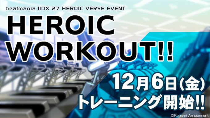 [【公式】beatmania IIDX@IIDX_OFFICIAL][2019/12/4 17:58:02] 【イベントのお知らせ】未来のヒーローを目指して、候補生が集うヒロイック・ジムで「心」「技」「体」を鍛えよう!新イベント『HEROIC WORKOUT!!』12/6(金)開始! #IIDX |