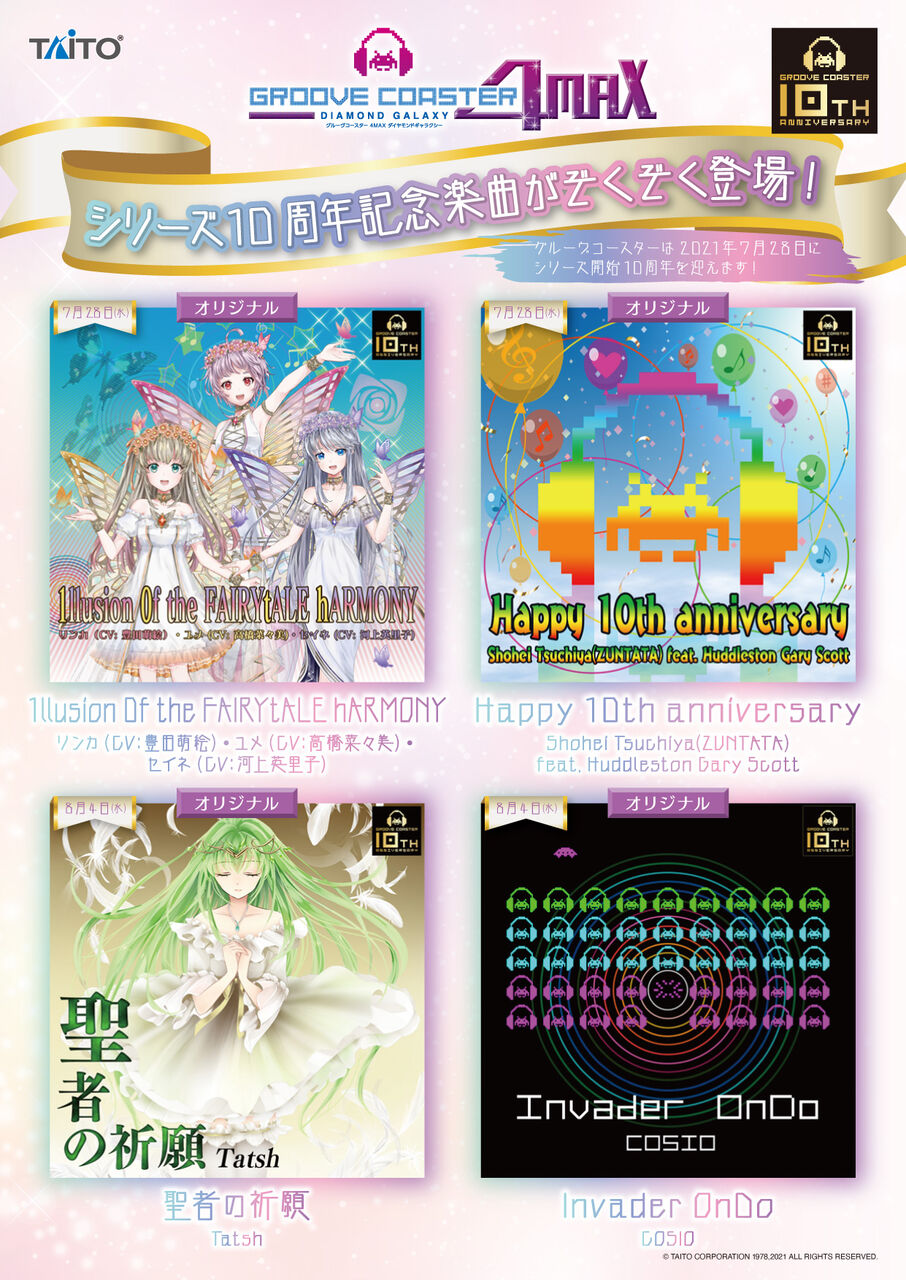 アーケード版「グルーヴコースター 4MAX ダイヤモンドギャラクシー」でも本日7/28より新曲配信!「1llusion 0f the FAIRYtALE hARMONY」「Happy 10th anniversary」の2曲が登場!