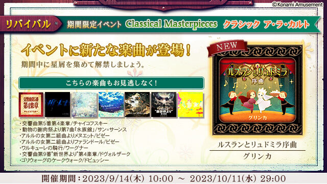 9月14日(木)10:00より、期間限定イベント「Classical Masterpieces クラシック ア・ラ・カルト」に新たなエピソードが追加!楽曲『ルスランとリュドミラ序曲』が解禁できます! #ノスタルジアhttps://t.co/fuIn2UPp2R pic.twitter.com/DGlLVTdsaL