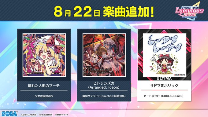チュウニに限るとSUN PLUSは4曲、LUMINOUSなんてゆっくりで東方追加終わったし LUMINOUS PLUSはもうこれで終わりかもしれない コラボ以前に東方追加そのものを減らしてるとしか |