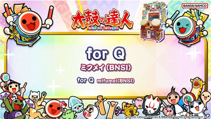 明日、2024/9/14(土)から、#太鼓の達人 (ゲームセンター版)で、ナムコオリジナル『for Q / ミフメイ(BNSI)』が遊べるドーン♪