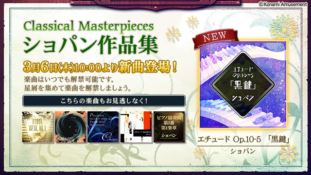 3月6日(木)10:00より、「Classical Masterpieces ショパン作品集」に新たな楽曲『エチュード Op.10-5 「黒鍵」』が登場します!ぜひお楽しみください。 #ノスタルジアhttps://t.co/b9F2DsiC5D pic.twitter.com/1xWRpZPP8E