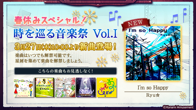 3月27日(木)10:00より、イベント「時を巡る音楽祭 Vol.I」に新たな楽曲『I'm so Happy』が登場します!ぜひお楽しみください。 #ノスタルジアhttps://t.co/1vTpKcgwZP pic.twitter.com/rl6plSt0N1