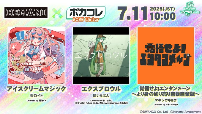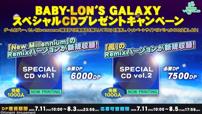 2025/07/09 楽曲追加のお知らせ 7月11日(金)10:00(JST)より、「BEMANI × ボカコレ2025冬」受賞作品を追加いたします。 「アイスクリームマジック / 雪乃イト」 「エクスプロウル / 晴いちばん」 「覚悟せよ!エンタンメ~ン ~より身の切り売り自暴自棄版~ / マキシウキョウ」 2025/07/09 BABY-LON'S GALAXYスペシャルCDプレゼントキャンペーン開催! DanceDanceRevolution A3のボスイベント「BABY-LON'S GALAXY」に登場した楽曲達が収録される、スペシャルCDキャンペーンを開催! 「DP」をためて応募しよう! 「BABY-LON'S GALAXYスペシャルCDプレゼントキャンペーン」の詳細はこちら! |