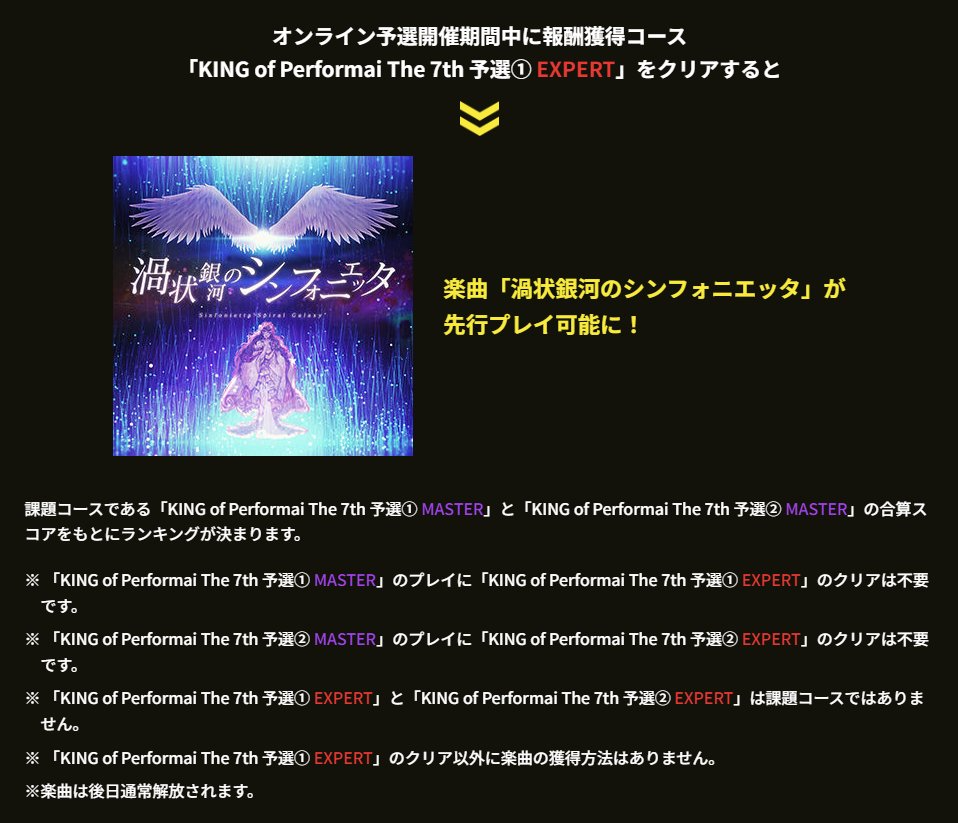 期間中に「KING of Performai The 7th 予選① EXPERT」のコースをクリアすることでゲキマイ楽曲「渦状銀河のシンフォニエッタ」が解禁するよ!